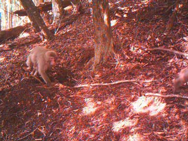 2010.4.6 2:10 イノシシ 4時間前にシカが通った場所の近くで、タケノコを掘り当てて食べている。イノシシとシカの、タケノコを探す能力の差は歴然である。 |