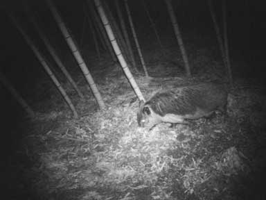 2010年5月8日22時39分 イノシシ その2 うちの1頭は乳腺が張り、背中前半分に、たてがみのような毛がある。動画映像はファイルサイズが大きいため、こちらからご覧ください。 |