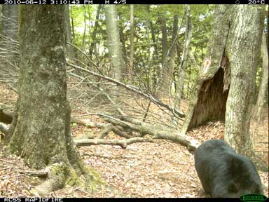 2010.8.4 6:21:32 立ち去る。 クマは毎年この時期に樹洞の中を探ったり登っている。おそらく、カマドウマなど樹洞内の虫を捕食しにやってきているのであろう。2007〜2008年の映像写真はこちらから。 |