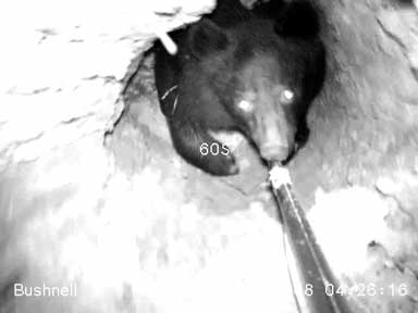 標高950mほどの雑木林の中のミズナラの巨木の樹洞の内側に下向きに設置したカメラの写真・映像をご覧ください。樹洞は、ミズナラの生きた大木にできたもので、開口部の高さが1mくらい、樹洞の内部の空洞の高さは3m位あるものです。2007年、2008年、2010年、2011年と最近連続してカメラを設置していますが、今回は、内側に小型のカメラ(下写真)を下向きに設置しました。樹洞内にはマダラカマドウマが多く、そうした虫を求めて、ヤマネ、コウモリ(種は不明)、ヒメネズミ、テン、ゴジュウカラなどが捕食行動等をおこなったり、クマやアナグマものぞき込む様子が撮影されました。